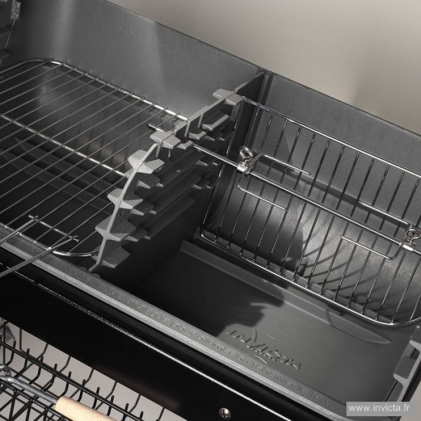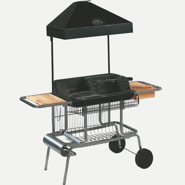– Очень большая емкость из чугуна – Две зоны приготовления пищи. – Решетка гриль регулируется по высоте. – Вертел электрический на батарейках с регулировками. – Раздвижной вытяжной шкаф. – Сбоку деревянная доска с выдвижным ящиком – Сбоку деревянная съемная доска – Тележку из окрашенной стали легко двигать – Держатель для бутылок, нижняя корзина – Корзина держатель приправы.