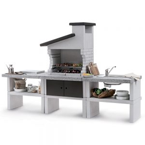 Барбекю для сада с широкой столешницей из Marmotech с отделкой под серый состаренный гранит. Огнеупорная топка с боковой стальной жаровней. Зольник с системой циркуляции воздуха “fast-fire-box”. Гриль-решётка 68х40 см. Металлическая вставка вставка в духовке.
