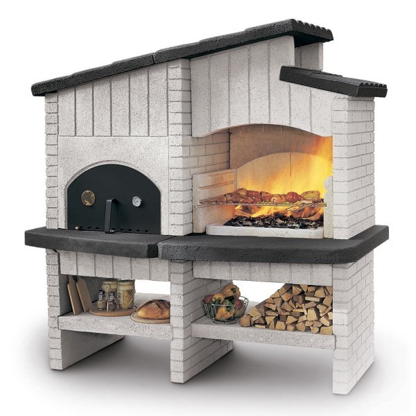 Окрашенное барбекю с решеткой и огнеупорной пластиной очага. Духовка с дверью, термометром и регулятором входящего воздуха.