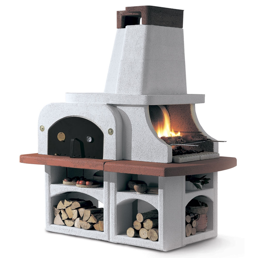 Неокрашенное барбекю с решеткой и металлической вставкой в духовке. Духовка с дверью, термометром и регулятором входящего воздуха.