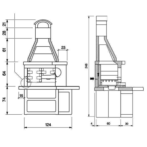 Барбекю из бетона с широкой столешницей, столешница из Marmotech с отделкой “состаренный” серый гранит. Огнеупорная топка с боковой жаровней и ограничителем для дров. Металлическая вставка в духовке. Гриль-решетка Bio из нержавеющей стали, 76х40 см. Зольник с системой “fast-fire-box”.